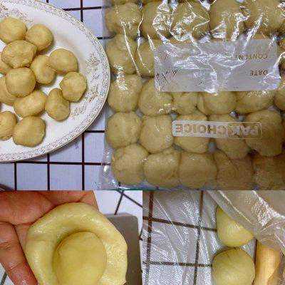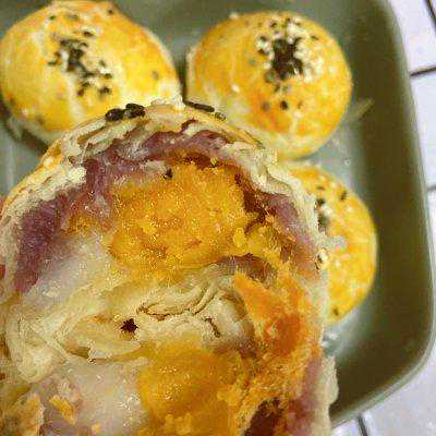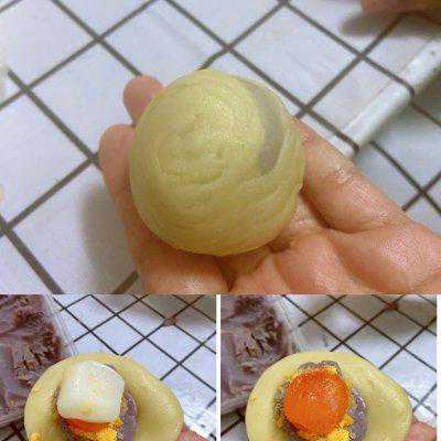 6、卷好的油皮按扁,一层芋泥,一层肉松,放入蛋黄最后放入Q丸(就是糯米糍)裹好揉圆。我这个用都是自己做的芋泥。不喜欢的,可以直接用豆沙包蛋黄,(豆沙每份20克左右就好)再来包。