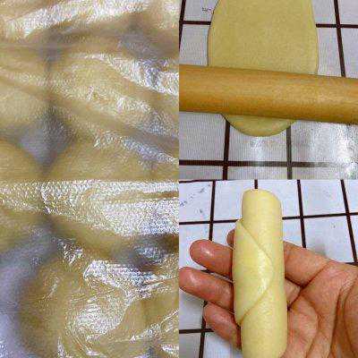 5、10分钟后再进行第二次擀成长长舌状,再卷起来。松弛10分钟