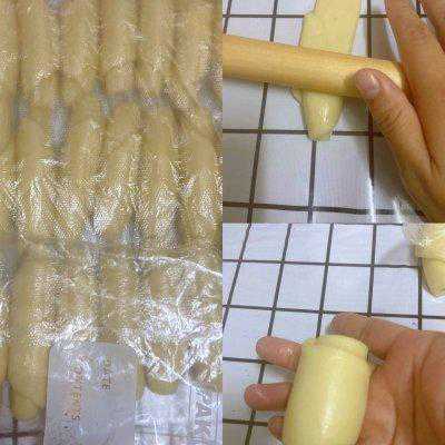 4、10分钟后,按上面图那样,用擀面杖擀成舌状卷好。再用保鲜膜盖住松弛10分钟。