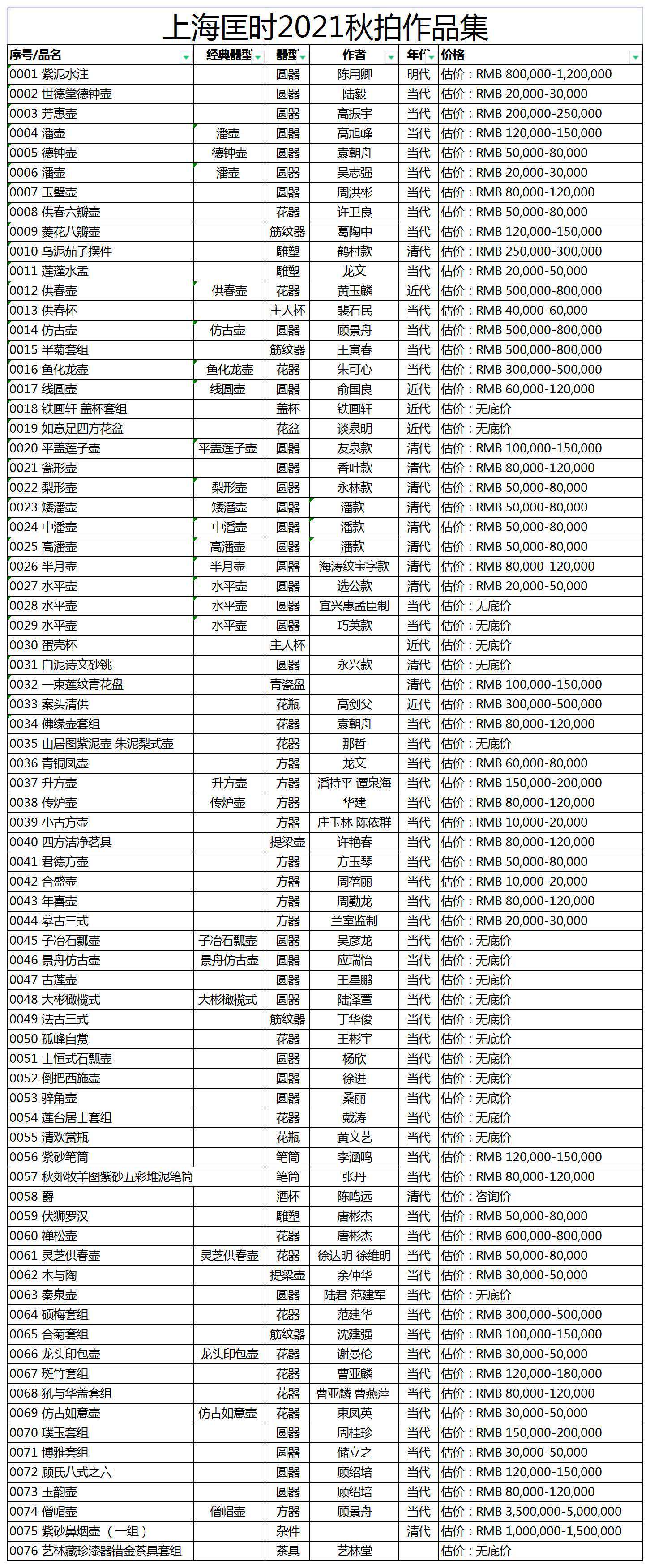小编整理了当时紫砂专场作品,按照年代可分明代作品1件、清代作品13件、当代作品55件和近代作品6件。