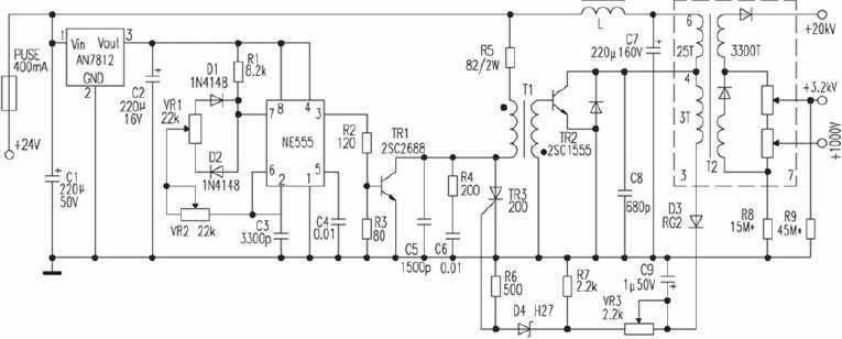 一些照相机CRT使用11.4cm(4.5英寸)纯平面CRT作为显示部件,其高压部件的阳极电压为+20kV,聚焦极电压为+3.2kV,加速极电压为+1000V,高压部件供电为直流24V。以下电路是为替换维修这些显示器的高压部件而设计(电路选自网络文章,原作者不详)。该电路的设计也可为其他升压电路设计提供参考。