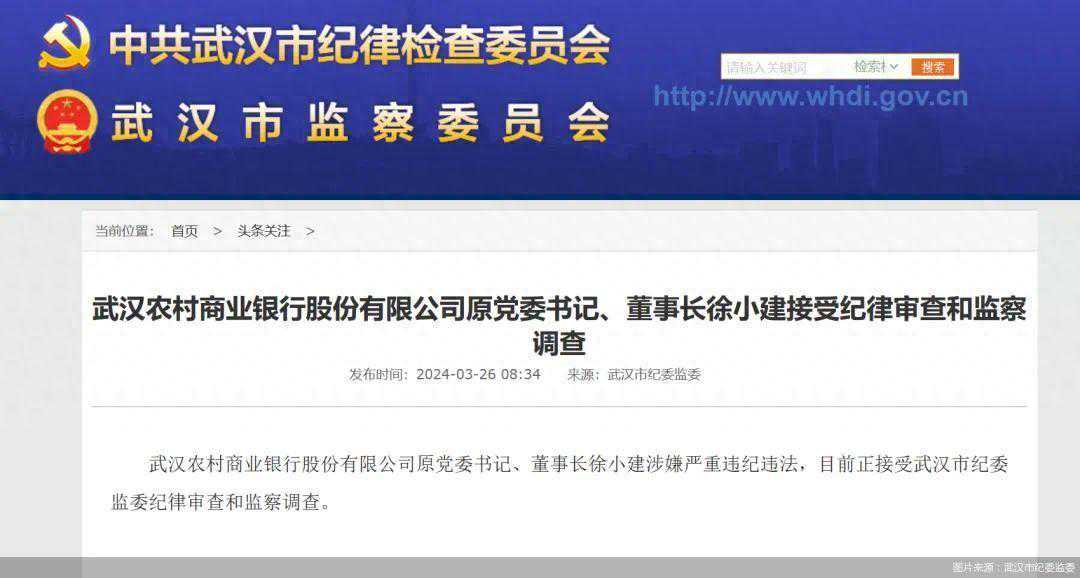 近日,武汉市纪委监委官网发布消息,武汉农商行原党委书记、董事长徐小建涉嫌严重违纪违法,目前正接受武汉市纪委监委纪律审查和监察调查。