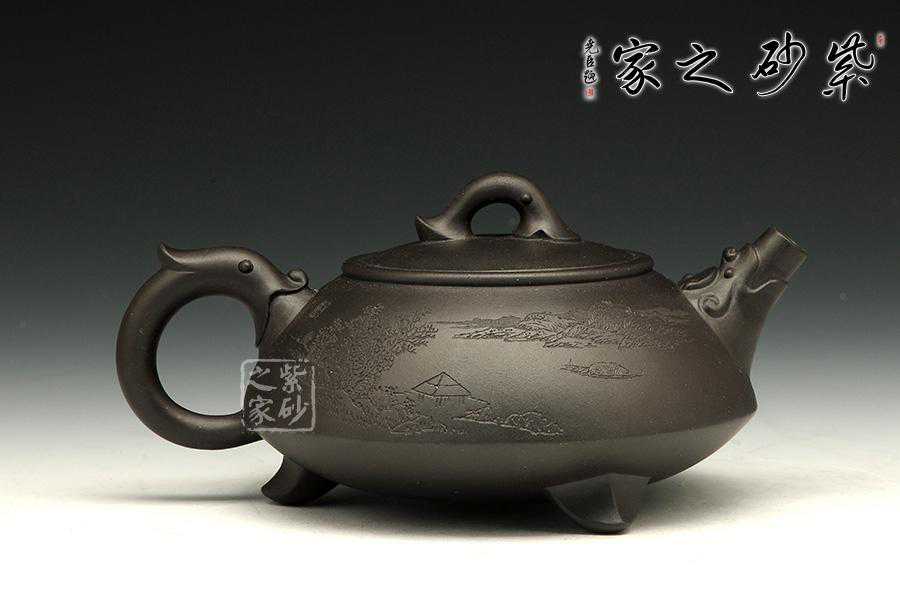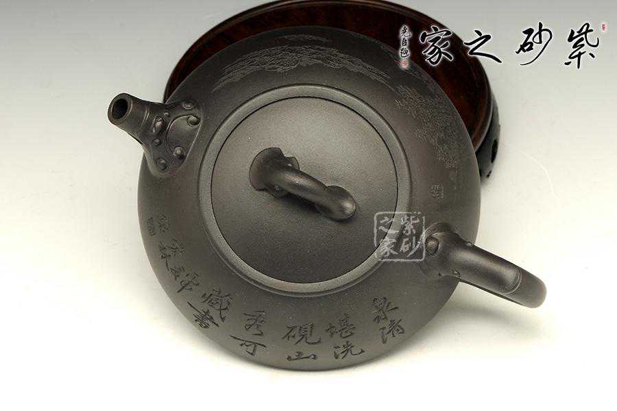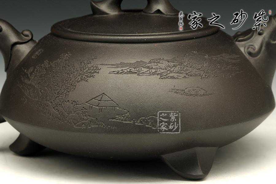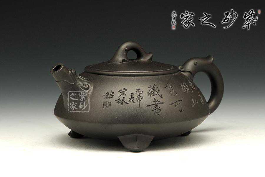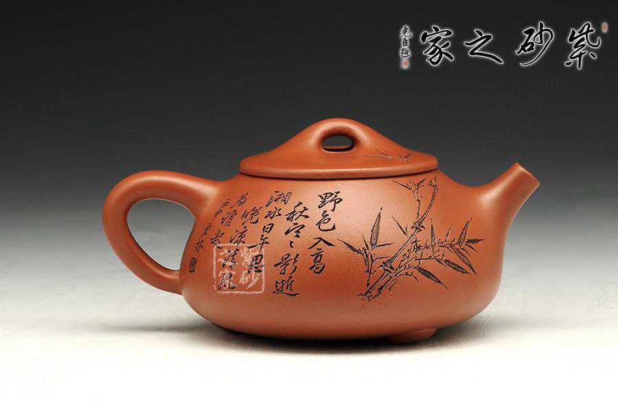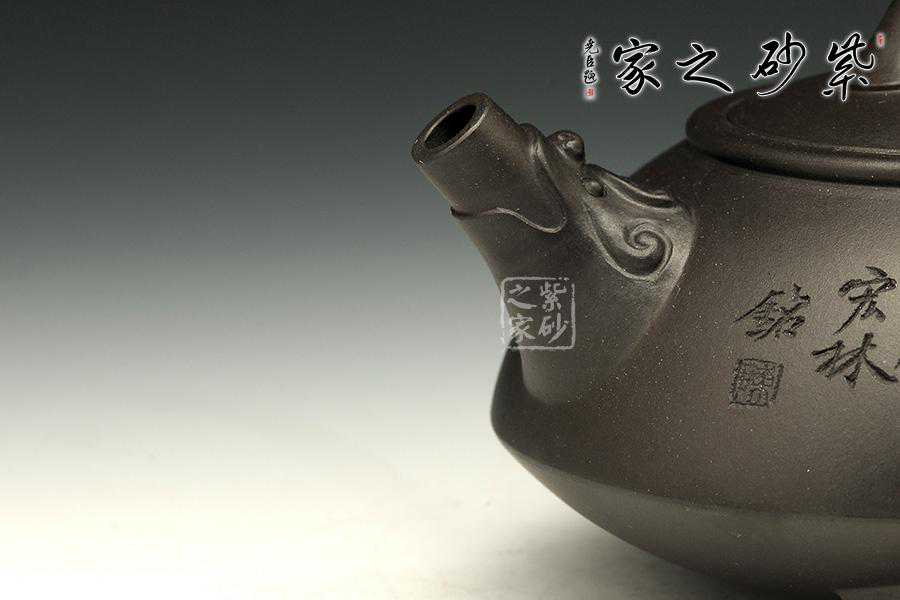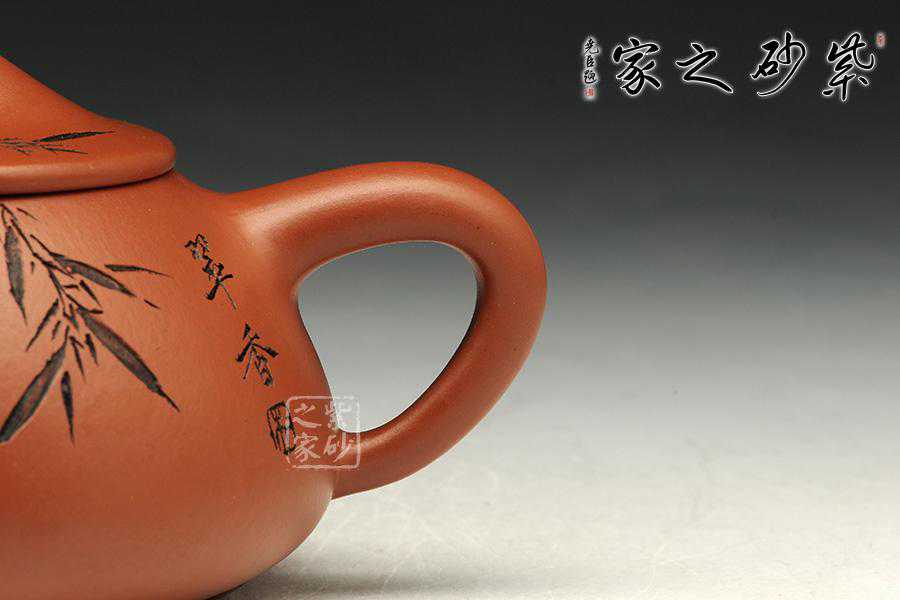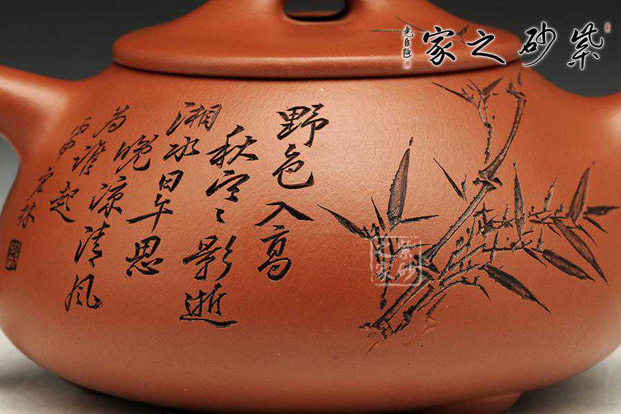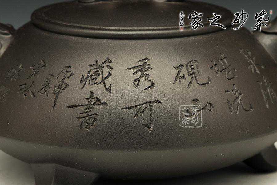 此壶为经典的石瓢造型,上敛下丰,整体比例匀称,器型优美。壶身以圆弧线条构成,流、把、钮处处衔接自然流畅,线条清爽利落,起承转合自如得体。壶嘴、壶把、壶身三位一体。底部三圆足立起全身,使壶显得挺括有神,展露出一种大气风范。壶身上刻有片竹叶,生机勃勃,寓意竹之坚强不屈的高尚品格;在壶身反面,几个刚劲有力的刻字,刀法刚劲有力,文化韵味十足。