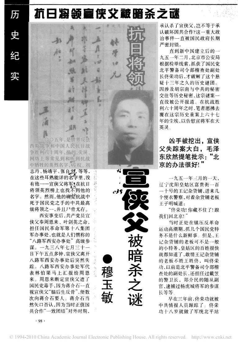 宣侠父,中国共产党党员。1924年黄埔军校第一期肄业。曾任察绥民众抗日同盟军第二军师长、八路军总部高级参谋。1938年8月在西安被国民党反动派暗害,时年39岁。