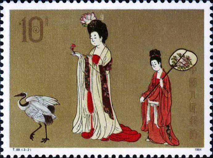 小型张展示的是《簪花仕女图》画的全貌。描绘了五位仕女和一名侍者。她们那高髻簪花、披纱露胸、丰颐厚体的风貌,也突出地反映了中晚唐时期仕女形象的时代特征。几位仕女,乍看近似,实际各有特点,眉目、表情殊异。右起第一人身着朱色长裙,外披紫色纱罩衫,上搭朱膘色帔子,头插牡丹花一枝,侧身右倾,左手执拂尘引逗小狗;对面立着的贵妇披浅色纱衫,朱红色长裙上饰有紫绿色团花,上搭绘有流动云凤纹样的紫色帔子,她右手轻提纱衫裙领子,似有不胜闷热之感;第三位是手执团扇的侍女,虽然衣着和发式不够突出,但神情安详而深沉;接下去是一髻插荷花、身披白格纱衫的贵族女子,右手拈红花一枝,正凝神观赏;第五位似正从远处走来,她头戴海棠花,身着朱红披风,外套紫色纱衫,双手紧拽纱罩;最后一位贵妇,髻插芍药花,身披浅紫纱衫,束裙的宽带上饰有鸳鸯图案,白地帔子绘有彩色云鹤她,右手举着刚刚捉来的蝴蝶,丰硕健美中显出窈窕婀娜之姿。画家还借小狗、鹤、花枝和蝴蝶,表现人物的不同嗜好和性格,卷首与卷尾中的仕女均作回首顾盼宠物的姿态,将人物活动收拢归一,成为一个完整的画卷。画幅的尽头,竖立起一面玲珑石,它后面是一株盛开的辛夷花,粉紫色的花朵陪衬着少许的绿叶,把整个画面气氛装点得非常和谐。