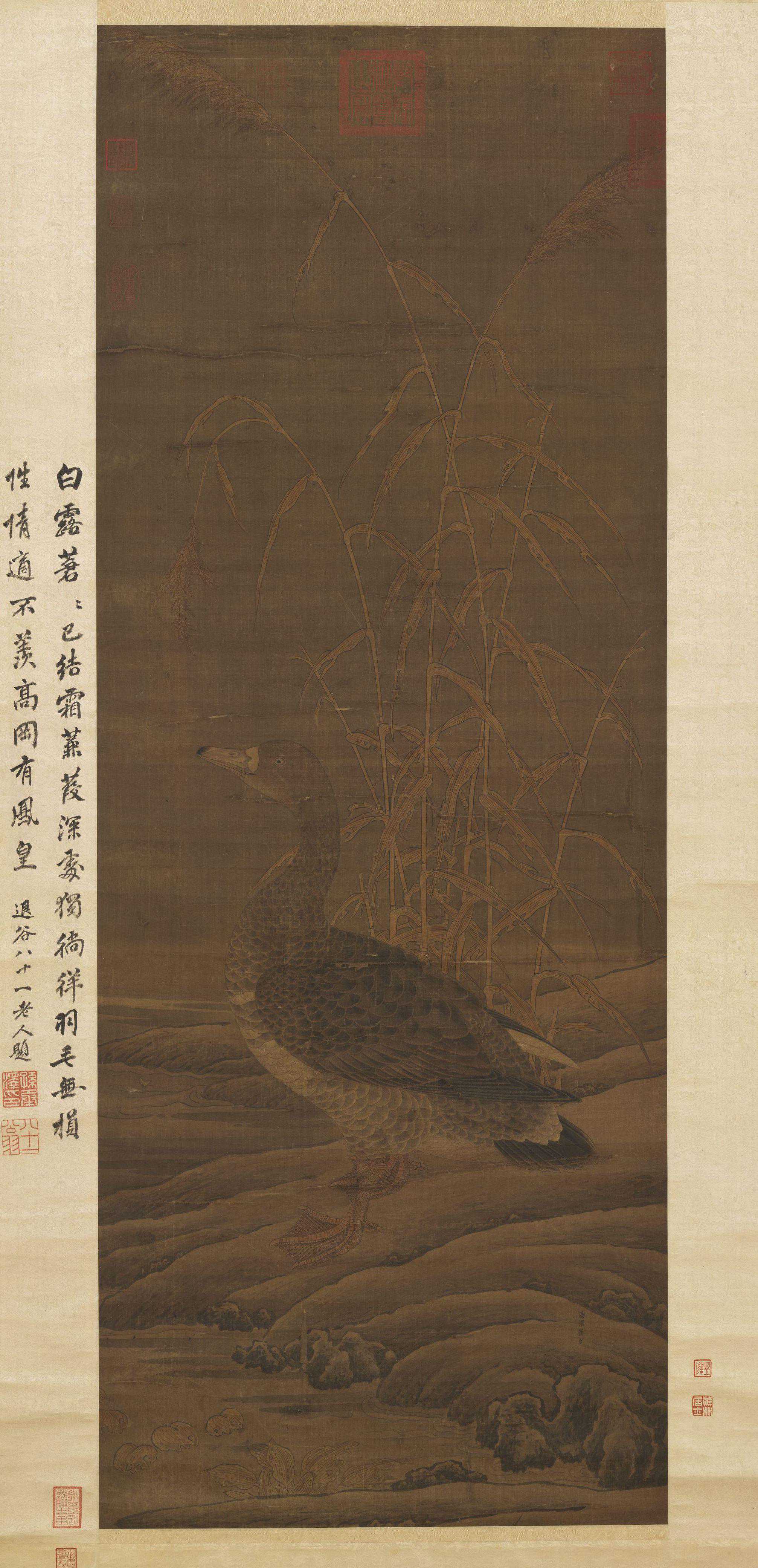 本幅有孙承泽题跋:白露苍苍已结霜。蒹葭深处独徜徉。羽毛无损性情适。不羡高冈有凤凰。退谷八十一老人题。