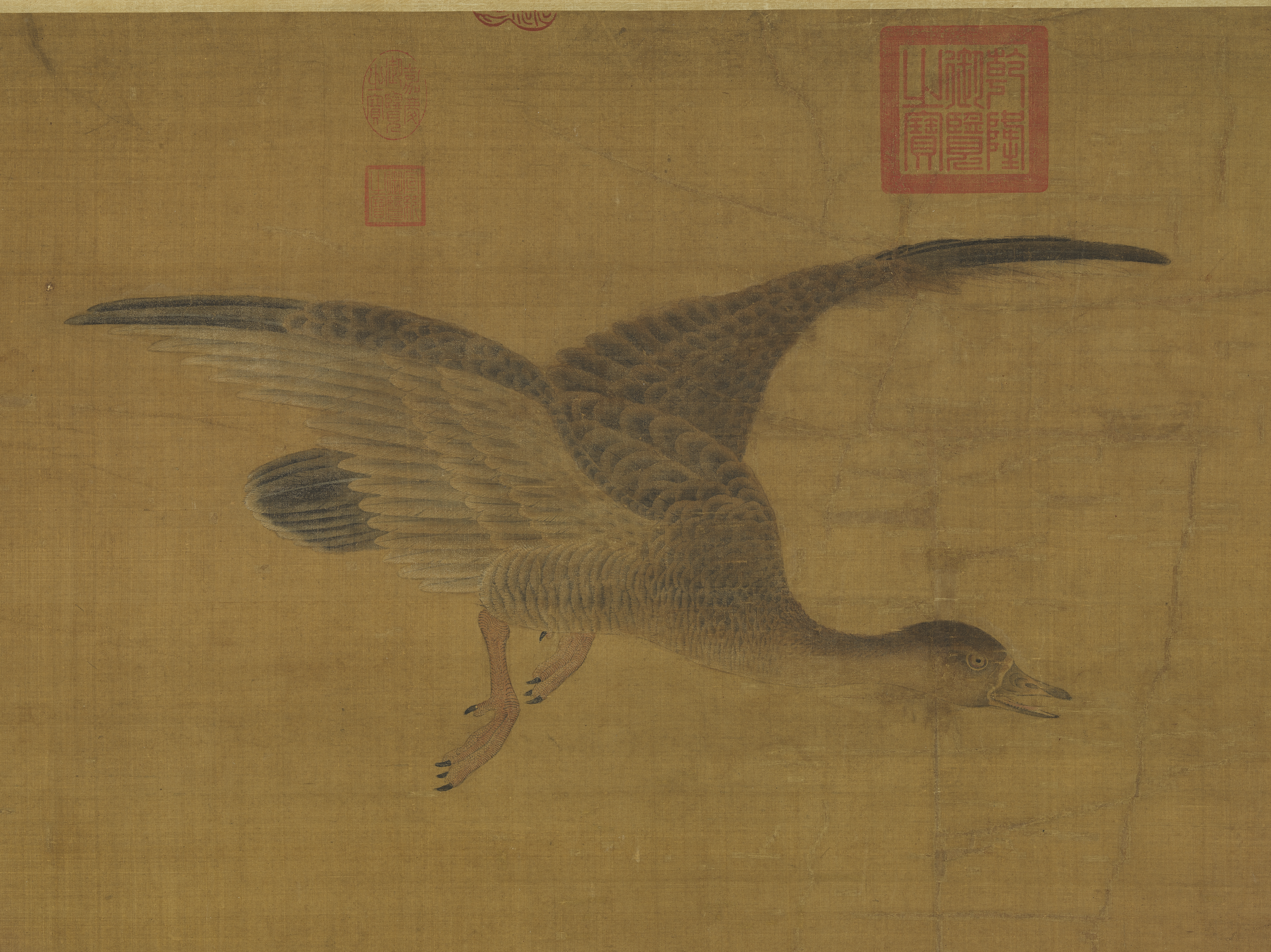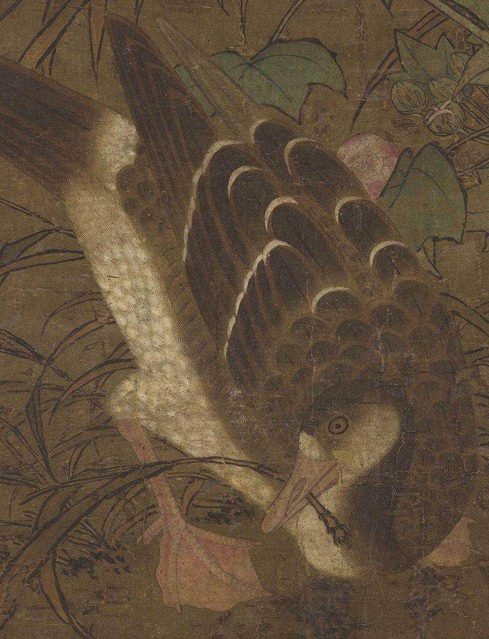 本幅绘荷叶枯黄,芙蓉展艳,一派秋光旖旎,花间鹡鸰腾跃,翡翠静静停留,两鸿雁振翅凌空,意在千里。无画家款印,旧传为崔氏之作。