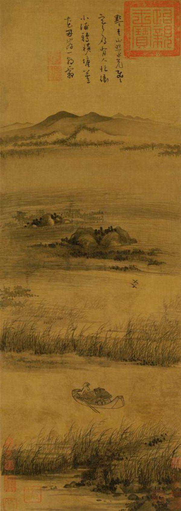 以平远法绘秋日水滨景色,水面微波荡漾,蒹葭苍苍,一双芦雁振翅飞起,渔父于舟头仰首凝视。画面空灵寒寂,形成了平淡清远的境界。图中以平行置景的手法表现空阔无际的水泊,以浓淡变化的水墨表现远近层次,平中见奇。