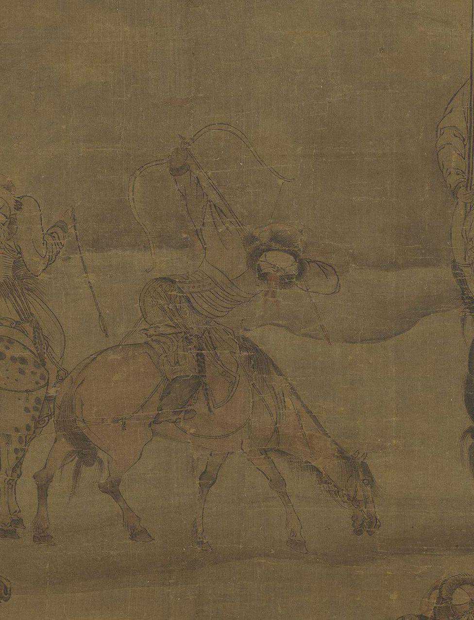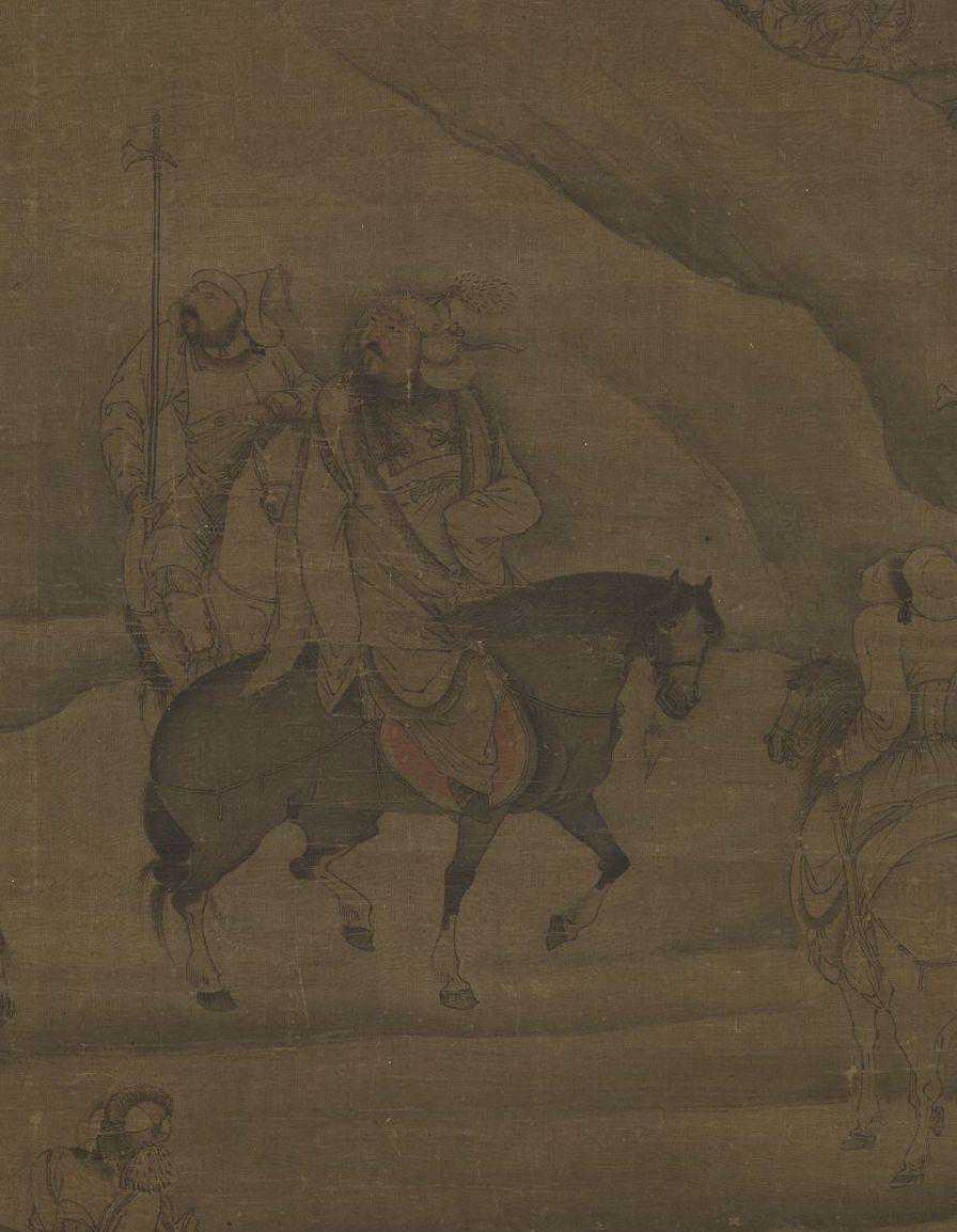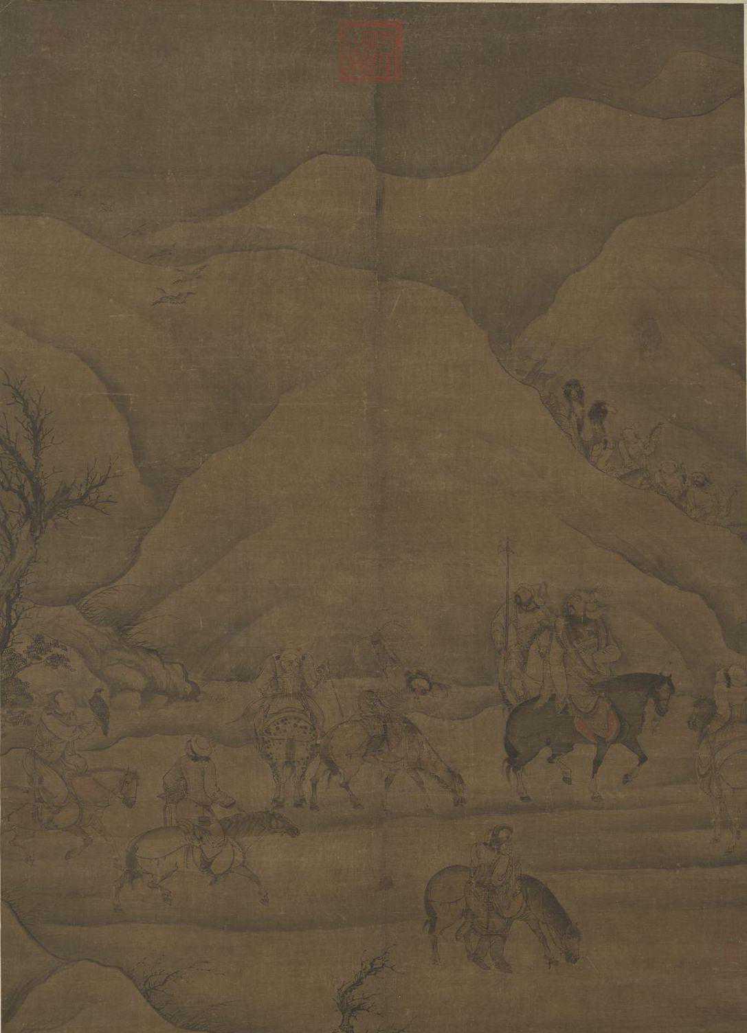 群山环抱中,一列狩猎的队伍,正沿着山路,缓缓行进着。骑队里,有人发现了天上飞翔的鸿雁,立刻搭弓上弦,蓄势待发。其余众人,有的伫足仰望,神情专注,也有的操控猎鹰,随时预备接应。画家显然有意借助周边景物的描写,来烘托整件作品的肃杀气氛。所以无论是皴山,或者画树,用笔均极精简,很成功地营造出北方朔漠的地形特征。元代帝王喜好狩猎,曾屡次传召画家绘图,以记录当时的盛况。