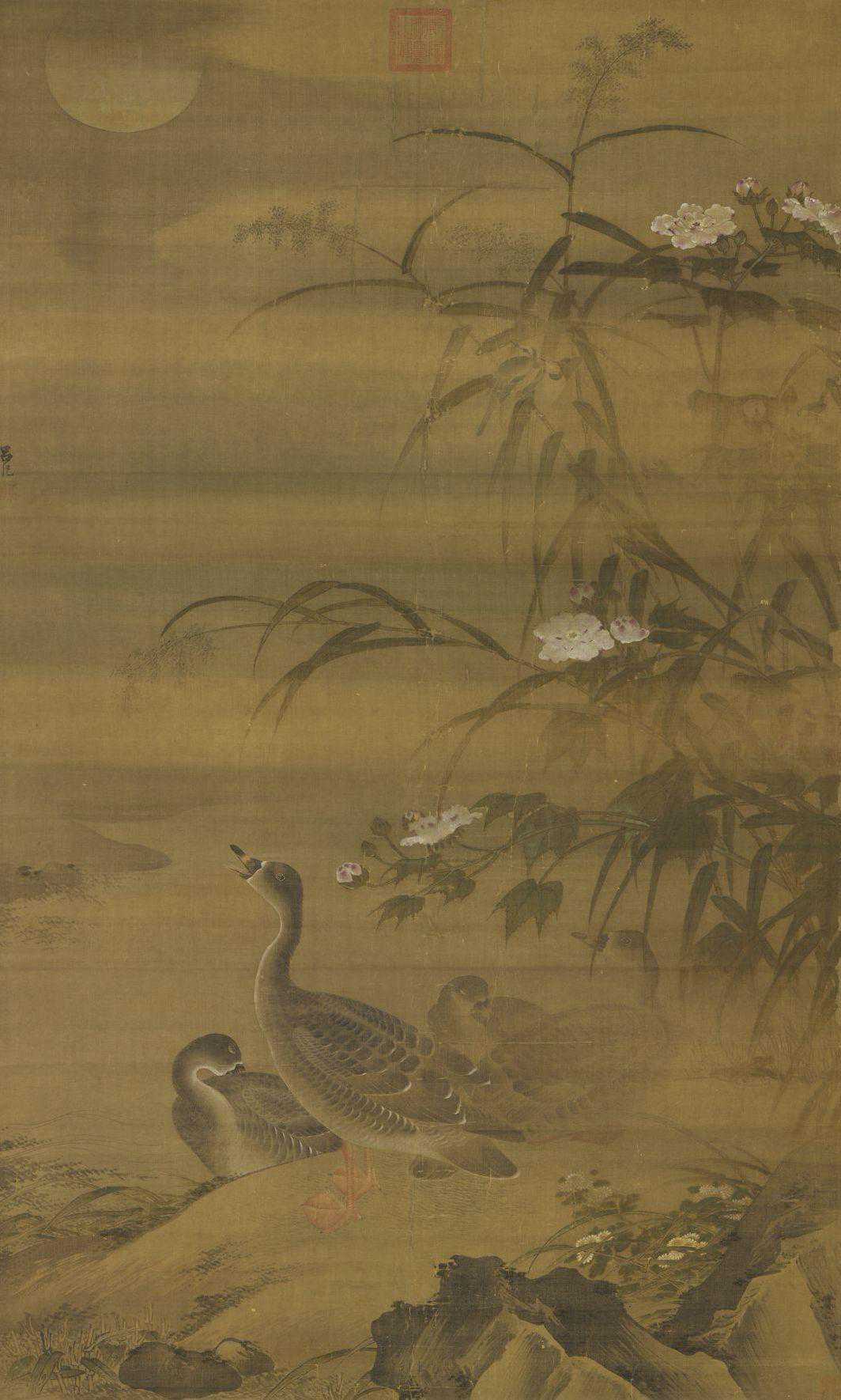 烟岚迷漫的秋夜里,明月半悬,四只豆雁栖息在半隐半现的木芙蓉和芦苇丛间的坡地上,其中三只已入眠,另一只则正对着明月引颈长鸣。但作者所要呈现的应不只是雁群在夜间栖息时,会由一雁警戒守夜的习性而已,还有一份对时、对景抒发情怀的心境,进而画出了秋夜的凄清。幅中画鸟画花的笔墨,工整细致而不刻板,画石则较写意,这种结合工写,又能掌握住情境气氛的作品,正是吕纪所擅长的绘画风格,并对后世画家有极大的影响。