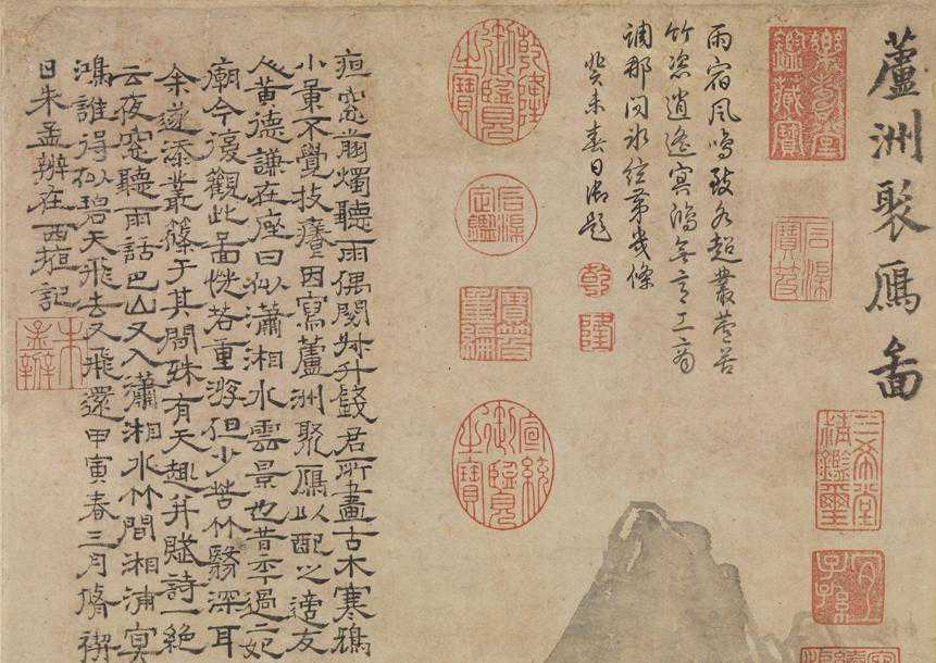 《芦洲聚雁图》有画家朱芾隶书自题:夜牕剪烛听雨,偶阅叔升钱君所画古木寒鸦小景,不觉技痒,因写芦洲聚雁以配之。适友人黄德谦在座,曰似潇湘水云景也,昔年过二妃庙,今复观此图,恍若重游,但少苦竹翳深耳。余遂添丛篠于其间,殊有天趣,并赋诗一绝云:夜牕听雨话巴山,又入潇湘水竹间。湘浦冥鸿谁得似,碧天飞去又飞还。甲寅(1374年)春三月修禊日。朱孟辨在西掖记。