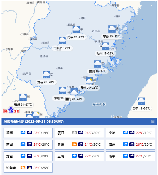 22日,全省阴有阵雨或雷阵雨,部分有中到大雨,其中三明的局部有暴雨。