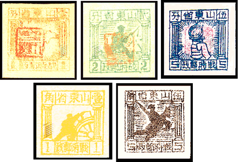 1942年2月7日,山东省战时邮务总局成立后,赵志刚局长于同年3月请山东省战时工会文书科张剑、韩寓吾、王济让等三位同志设计,全套5枚。分别是“山东地图”1分、“战士冲锋图”2分、“火炬图”5分、“时代车轮图”1角和“骑兵图”5角,石印、薄纸,邮票图幅18×18毫米,无齿孔,北海币。票上加盖红色“总局之章”的印章。邮票上下两端分别书写“山东省”“战时邮政”。首次印刷总款额3万元。