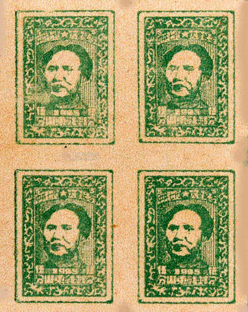 邮资图右侧,是山东战邮第一版“毛泽东像”邮票其中5角棕色1枚,也是全国解放区首次发行毛泽东像邮票。
