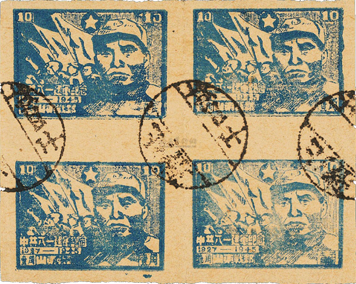 山东战时邮政发行“中共八一建军纪念”邮票方连