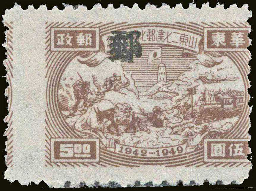 邮票设计家为了充分表现山东战邮职工运送邮件的艰苦战斗情景,在该套邮票图案中间画有敌岗楼一座,岗楼顶上插有日本旗一面。面值五元的这枚邮票印出后,人们感到日军军旗占据邮票中央欠妥。为此,除已印好外,其余十种均在未开印前,就从版模上把日军军旗铲掉了。当时由于平信邮资5元,需用量大,故未重印,只在日本军旗上加盖了一个“邮”字或“战”字。有手工加盖,有排版机盖,使用的字头有五号字体,也有四号字体,有黑色、紫色,也有少量的漏盖票,目前已发现有13种不同形式的加盖。