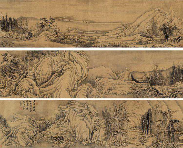 王翚山水画,有早、中、晚三期的变化,25岁以前为早期,主要摹仿古画,笔墨尚未成熟,显得有些幼稚,35岁到60岁为中期,这时期他广泛吸取前人优良技法,融汇南北诸家之长,作画又专心精意,不肯苟简,因此,这一时期作品最为精彩,技法精巧,清丽工秀。《康熙南巡图卷》就属这一时期的作品。60岁以后是他的晚期,由于求画者甚多,作品多为应酬之作,难免粗制滥造,还出现了不少代笔画。由于技法纯熟,形成了一定格式,下笔也往往带有习气,不及中期生动英姿,但晚年也有一些杰作。