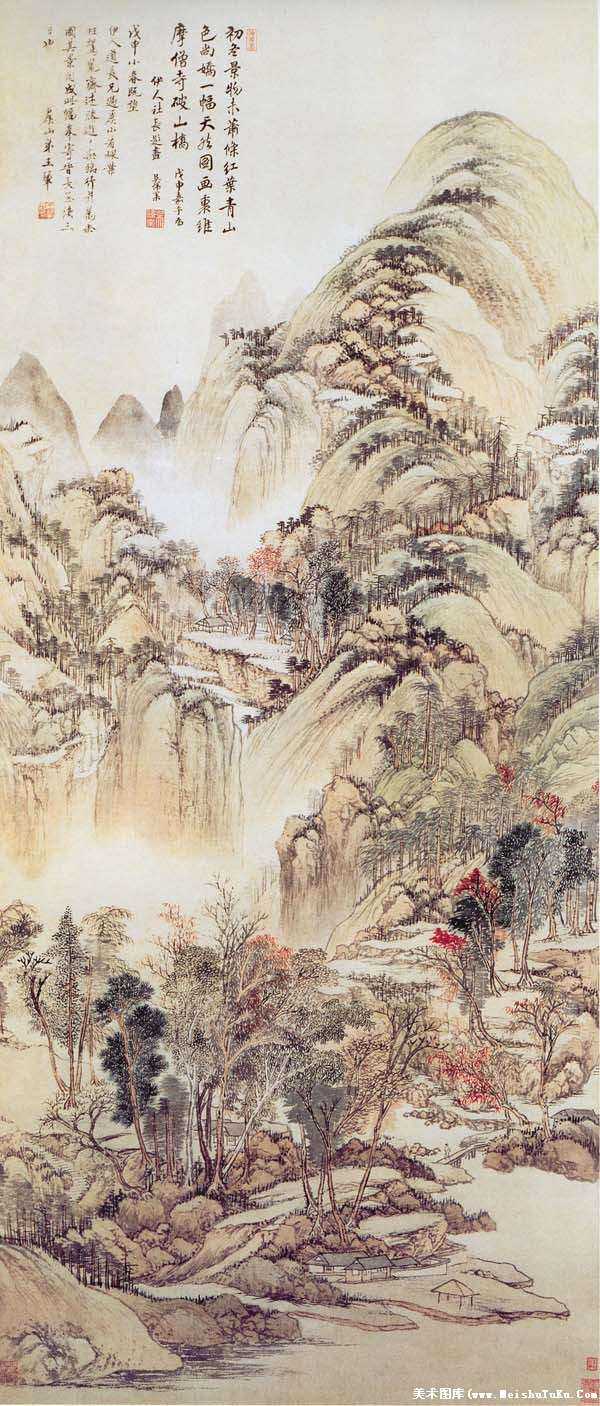 王翚(1632-1717)清代画家。字石谷,号耕烟散人、剑门樵客、乌目山人、清晖老人等。江苏常熟人。出身绘画世家,幼承家学,初学画于张珂,后又得到王鉴、王时敏指点。擅山水,初摹黄公望,后广泛师法唐宋元明诸家,转益多师,加以发展变化,形成个人风貌。曾说“以元人笔墨,运宋人丘壑,而泽以唐人气韵,乃为大成”。其画笔墨功底深厚,长于摹古,几可乱真,但又能不为成法所囿,部分作品富有写生意趣,构图多变,勾勒皴擦渲染得法,格调明快。在四王中比较突出。其画在清代极负盛名,康熙三十年奉诏绘制《康熙南巡图》,3年完成,得到皇帝的褒奖,被视为画之正宗,追随者甚众,因他为常熟人,常熟有虞山,故后人将其称为虞山派。有《康熙南巡图》(与杨晋等人合作)、《秋山萧寺图》、《虞山枫林图》、《秋树昏鸦图》等传世。