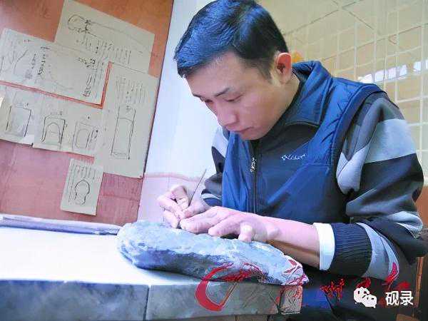 一些在别人看来已是废石的石料,在伦少国手上,很可能被点石成金,最有代表性的是他雕的《慈爱砚》。