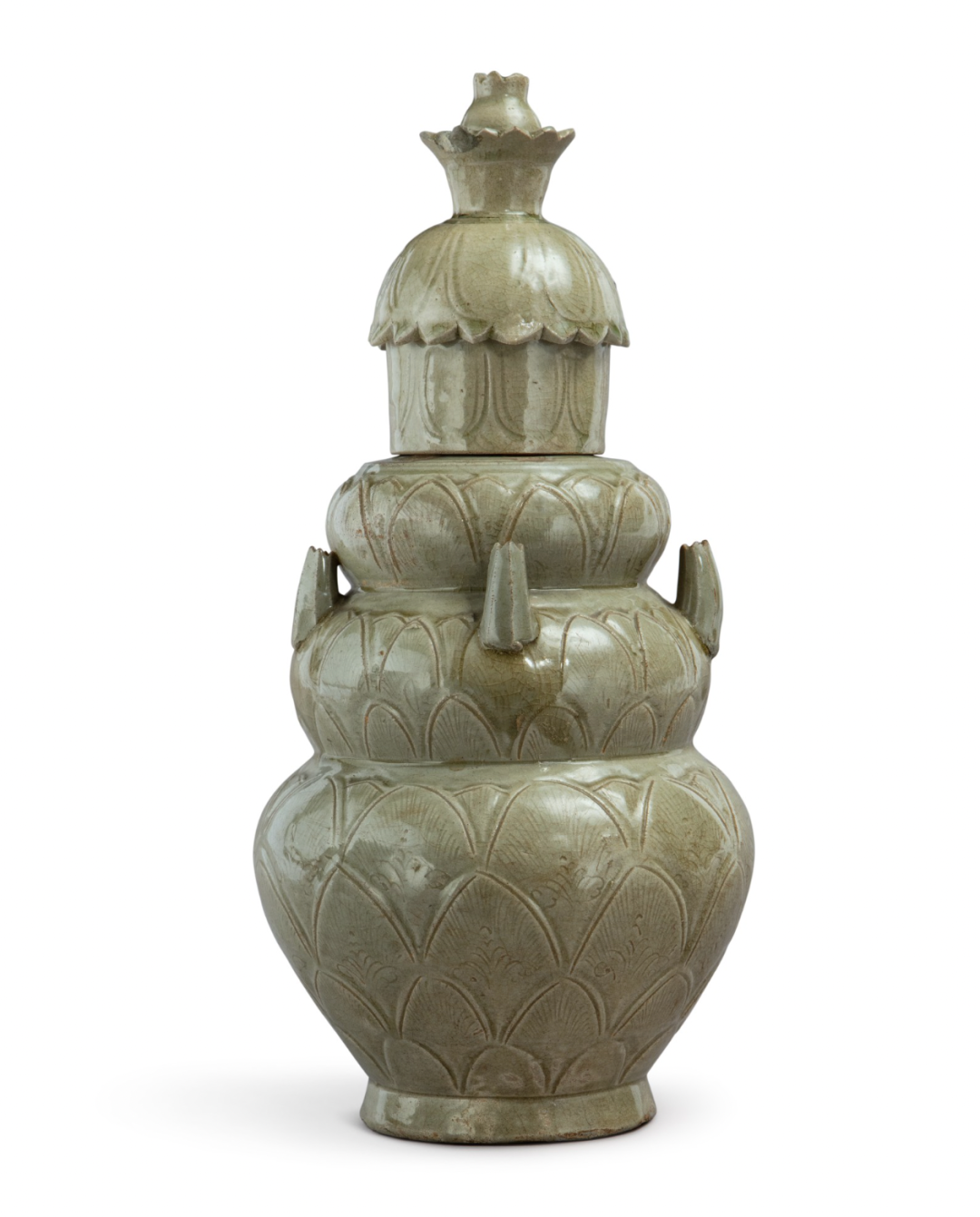 北宋龙泉窑青釉莲瓣纹五管瓶