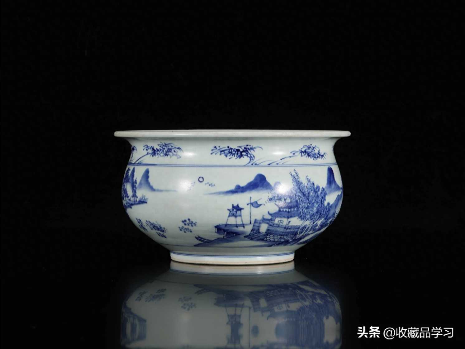 康熙青花山水人物纹炉炉撇口,束颈,鼓腹,圈足。炉外壁作通景式构图,绘青花山水人物纹,绘工细腻精湛,笔墨意味甚浓。可见群山环绕,山石与树木错落有致,曲径通幽,房屋数间,湖光山色之间,人们或居其所,或行于小径,清幽之中透着生机,大有田园生活之画意。整体画面意境深远悠长,令人心驰神往。