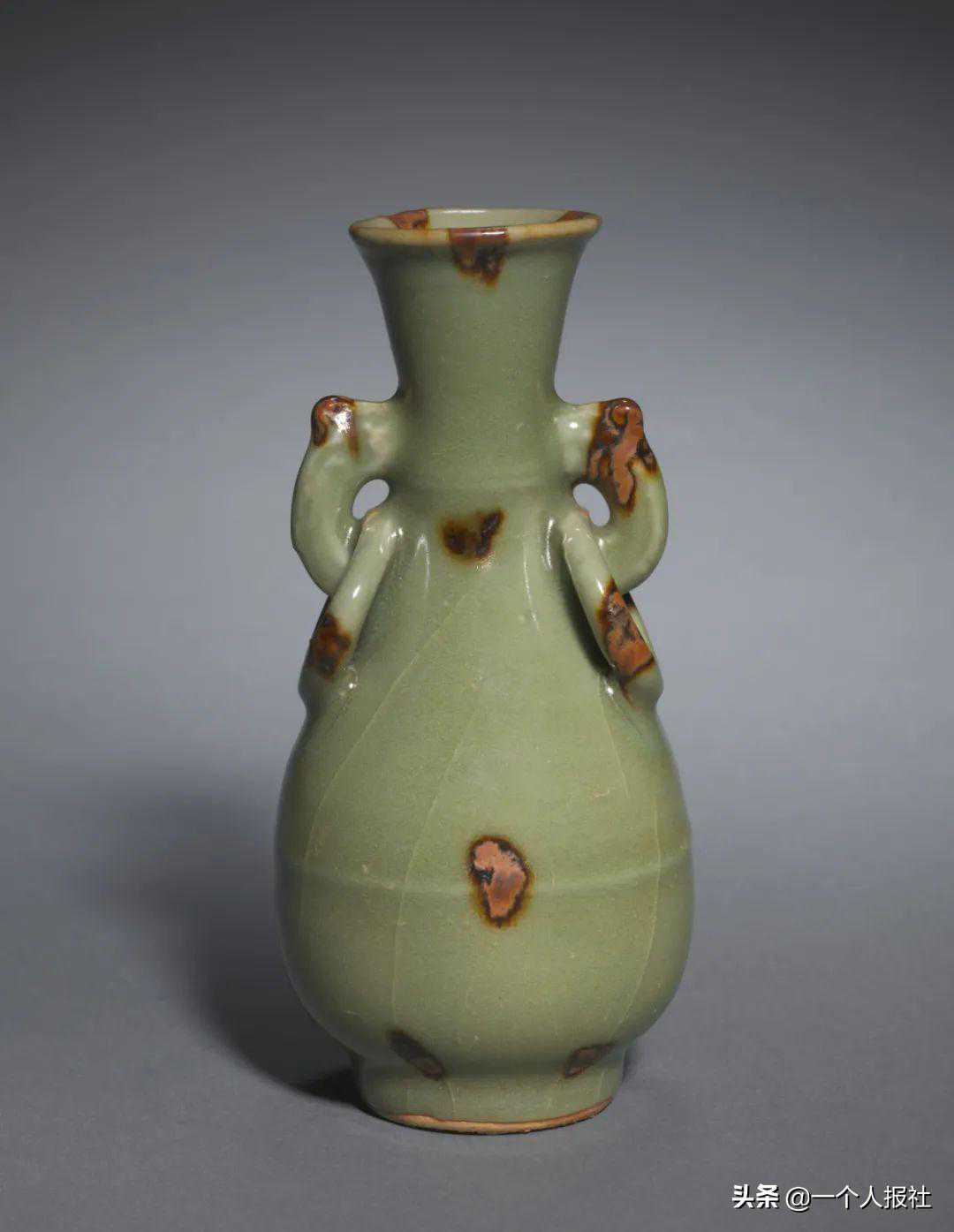 元龙泉窑青釉点褐彩象耳衔环瓶
