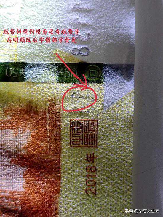 第三步:在高灯光下举起币斜对着灯光看字面,每一张正反面都需要过目一下,通常改号字面部分,正面会有字面凸起,并有细微纸张纤维毛糙现象,背面字面会凹下去,由于工具类似于玛瑙刀撵压过,比其他字面部分纸面纹路发亮。这样都是改号现象。
