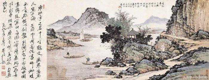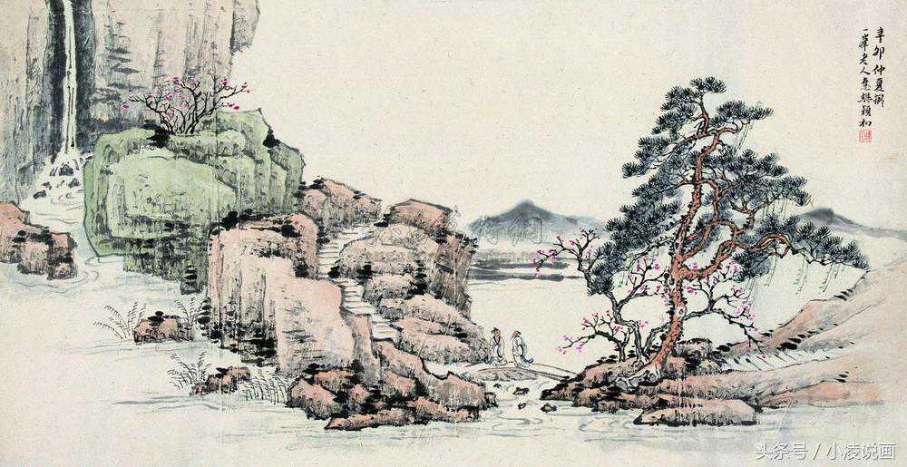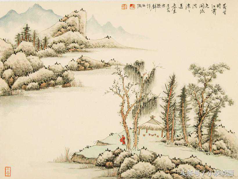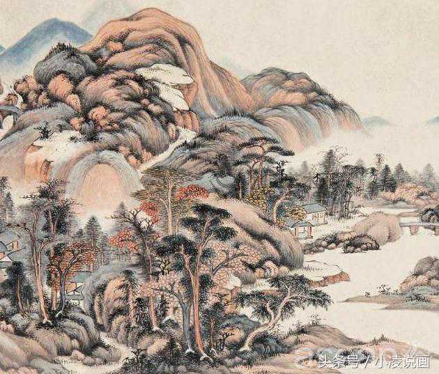 浅绛山水画法特点是素雅青淡,明快透澈。清代沈宗骞在《芥舟学画编》中说:“浅绛山水,则全以墨为主,而其色轻重之足关矣。”他强调了,笔墨仍为画面状物构形的基础,墨色足后,略施淡彩,画面色调单纯统一,减少浓淡和轻重的变化,而其色多施于山石之上。