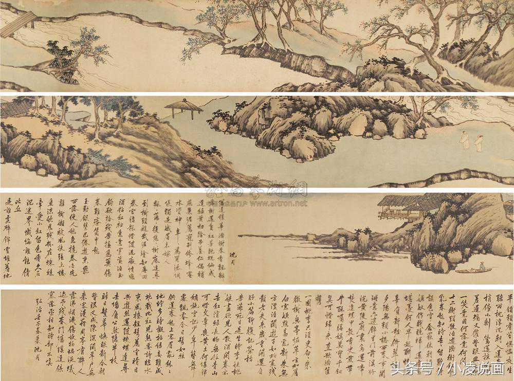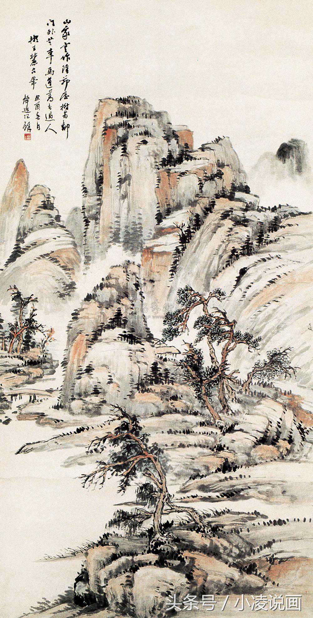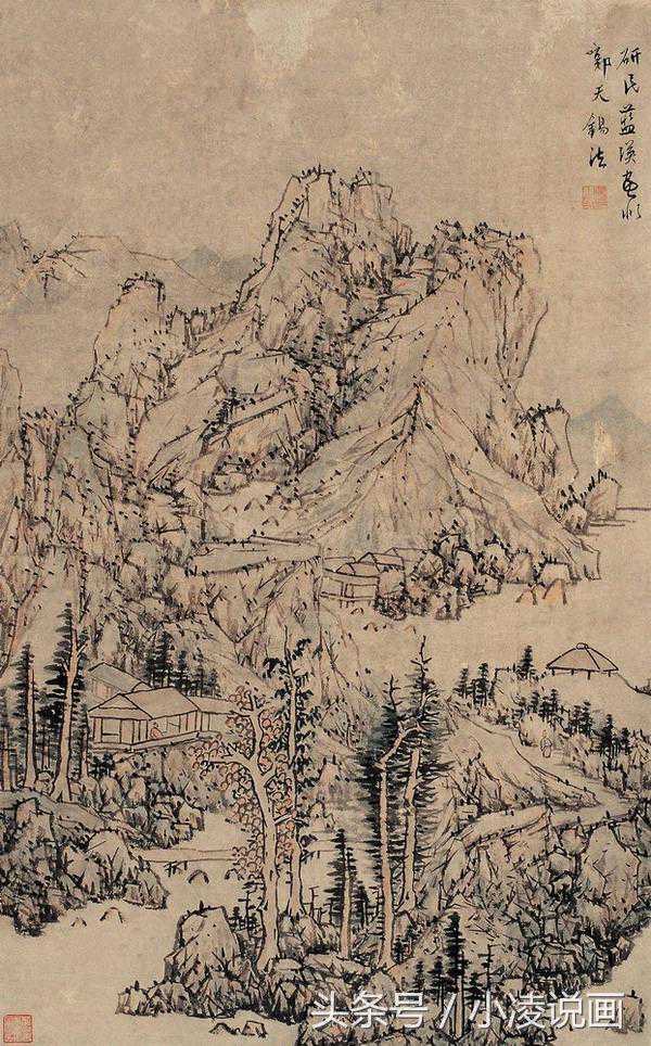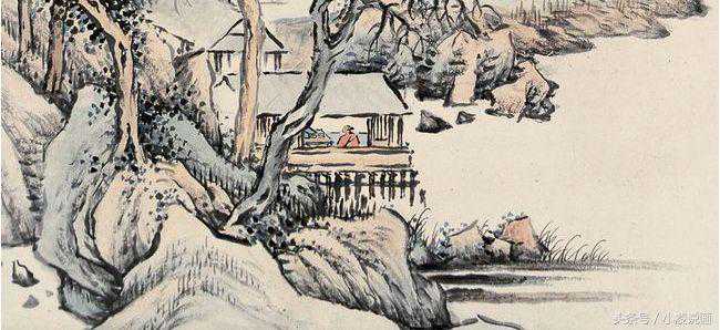 浅降法在水墨勾勒皴然的基础之上罩以淡彩,多以淡赭石色为主,个别地方罩以淡青花,使画面形成统一色彩基调,色不碍墨,墨不碍色的着色方法,元代山水画家多用此法。