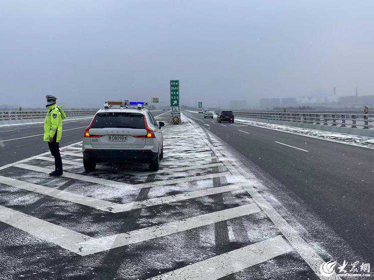 跨海大桥大队副大队长林琳、执勤民警刘伟联合山东高速养护等部门,在降雪第一时间进行除雪、融雪作业,连夜对重点路段喷洒液体融雪剂,相关除雪工作从凌晨1点一直进行到早上5点半,有效保障了辖区道路的安全畅通,确保了次日早高峰的正常通行。