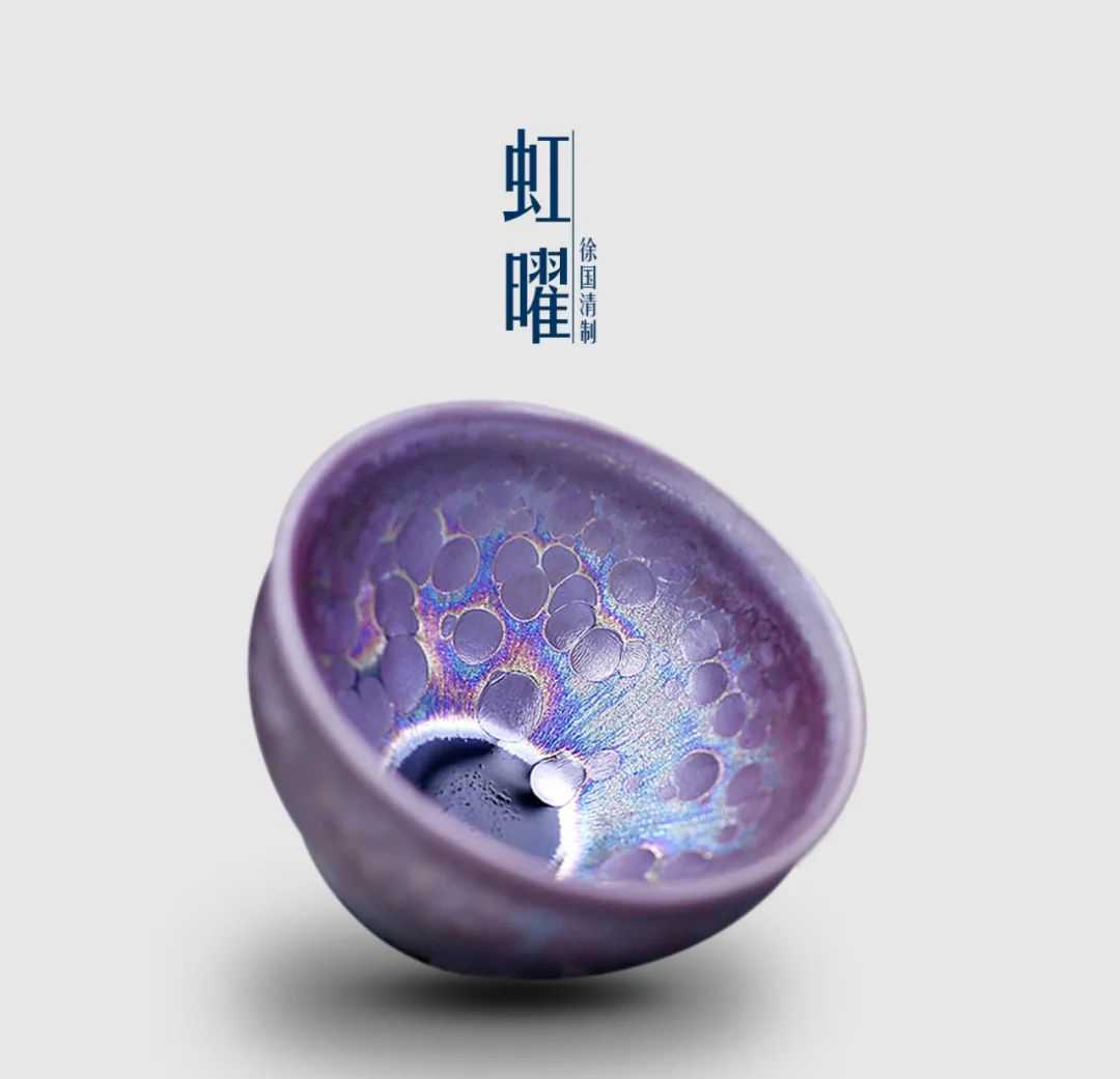 在我们日常使用建盏饮茶时,在高温冲泡的情况下,建盏釉表层的铁逐渐被氧化以及茶里丰富的矿物质与建盏釉表面的铁起轻微的反应,在两者交替的情况下,建盏釉面日积月累形成一层致密的氧化膜,沉淀出富有韵味的包浆,心境随和,坚持滋润,就可能出现七彩光的效果。