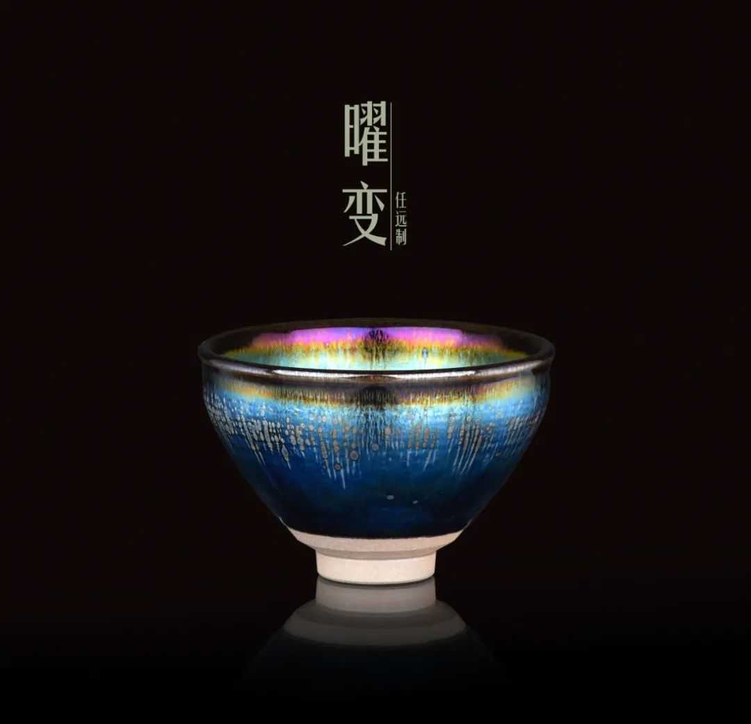 青年陶艺工艺师任远,中国建阳建窖建盏协会会员,喫茶龙窖窖主,七彩映日曜变釉面创始人,潜心研究建盏烧制技艺多年,独创的柴烧裸烧技艺烧制出经典的仿宋油滴、兔毫釉面,其烧制的作品被多家展览、博物馆收藏。把最传统的陶瓷作品用最先进的技艺和思想塑造出“老气新作”的茶器,任远手作依旧保留住传统油滴的颗粒,再加入曜变颜色变化的层次感,将两种变化融合并烧制出新的釉面窖变效果。