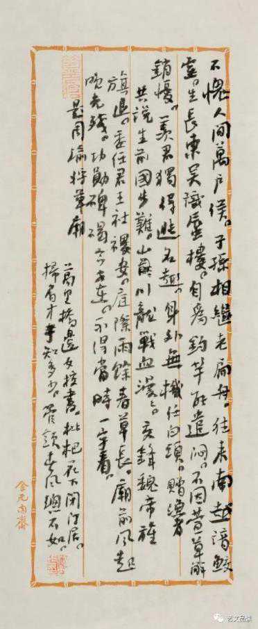 书写对于中国文人而言,是一件最普通的认知实践,其间代表了传统人文的精神内涵。那些经常把书法上升到玄学的理论,实质上是距离艺术越来越远,切不可去迷信那种僵硬或天书类的专业术语。读书法作品的好与坏,不仅仅局限在结构和几种线条上,在线条间你很难捕捉到一种技术上的演变,重要是在书写中能读懂它蕴涵的精神和格局。透过潘继坦书法的笔墨和点划,去解读他作品内核里掩藏的人文情怀,同时去体验他功力上的纯熟与深浅。其实在他那些无言的笔墨行走间,最应该产生的是一种张力,但作者用寂静无声的线条,以及章法构成了一种彰显生命与情感的艺术力。也许正是他寂静的书写方式,触动并链接起了读者的情感交流,这样的书法作品,才是一种具有文化品味的艺术。那种弥漫着真挚的文人情怀,浮现着历史痕迹的传承,才能在书法艺术中占据了上层格局。