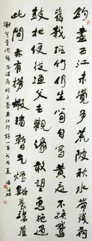 潘继坦的书法是在静中求变,力求让传承的笔墨融入当下。书法是检验传统文化的一种自我修为,也是一种民族文化习惯上的特殊依赖。在一段时间里传统曾被混乱的书界边缘化,书写的意义只是为了炒作需要,甚至在某些书家的追求里当成一场表演。观察一位书家的创作走向,看其静心书写的线墨气骨,深入到作品内的结字与架构,才可评判是否具备书家的标准。大凡对传统文化心存敬畏的艺术家,很少去看重那些江湖上的名利攀比,活得都比较纯粹而又丰富。他们对书写有自己的认识,甚至对书法充满了近乎宗教般的情感。因书法艺术有着特定的审美价值,能够抵达到一种气度与厚重的书风,从而进入到那种雄浑和朴拙的境界,书法才具有虔诚般的神奇感召力。
