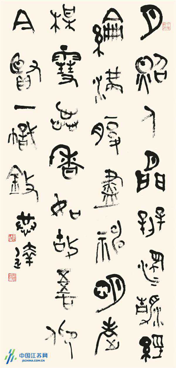 (大篆,自作诗《季翁赞》,180cm×90cm2009年,释文:月照人间辨浊清,经纶满腹尽神明。老梅雪蕊香如故,我仰今贤一帜擎。)