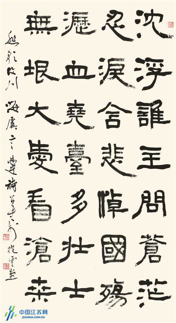 (隶书,自作诗《悲歌汶川》,180cm×97cm,2008年创作。释文:沉浮谁主问苍茫,忍泪含悲悼国殇。沥血尧台多壮士,无垠大爱看沧桑。)