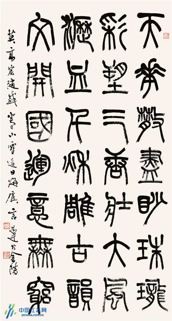 (小篆,自作诗,《访莫高窟》,180cm×97cm,2013年创作。释文:天花散尽妙珠珑,彩塑三唐壮大风。沥血千秋雕古韵,文开国运意无穷。)