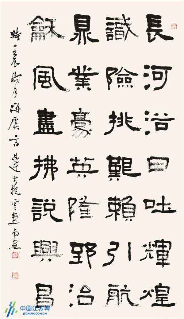 (隶书,自作诗,《新中国六十华诞颂》180cm×90cm,2012年创作。释文:长河浴日吐辉煌,识险排艰赖引航。鼎业豪英隆郅治,和风尽拂说兴昌。)