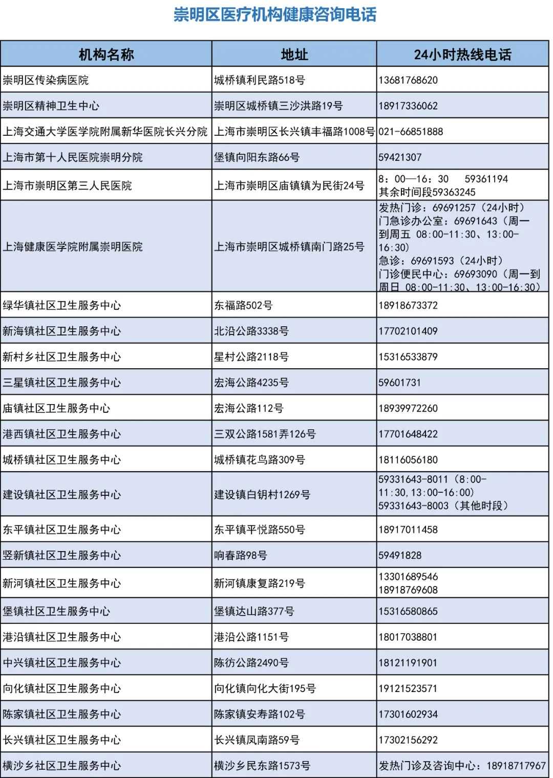 为了切实保障人民群众生命安全和身体健康,满足市民的卫生健康服务需求,崇明区各医疗机构开通了24小时健康服务咨询热线。如有任何身体不适,可按需拨打咨询热线问诊。