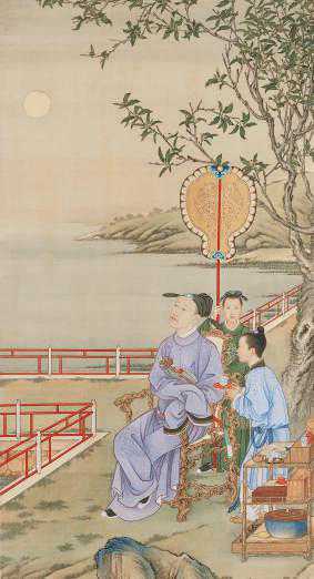 清代宫廷画家郎世宁绘有《雍正十二月行乐图》十二幅。其中“八月赏月”描述的是雍正帝在圆明园与众亲友一起赏月的场景。画面中,天上的大雁排成人字形南飞,寓意中秋时节,天气已转凉。一座三层的阁楼旁边,圆月在水中呈现倒影。阁楼前的露台上,雍正帝一行坐在案前赏月,其乐融融。《弘历观月图轴》则描绘了乾隆帝中秋赏月的场景。月夜里,湖塘边,老树下,乾隆帝凭栏而坐,欣赏着中秋满月。而他身后,两名小童或持扇而立,或端茶侍候,场面惬意舒畅。