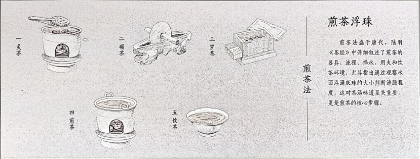成为国人日常必不可少的饮品,是茶从“存在”到“存续”经历的重要一步。由于中国人对茶色、形、味的永无止尽的追求,中国备茶方法历经传承与创新,发生了几度变化。唐代以来“备茶方法愈发便捷”,饮茶逐渐演变超越生活的艺术体验,这也就是茶艺的起源。茶饮的器具体系更是与昂贵、精巧的瓷器结合,通过外物之美映衬品茗之佳。