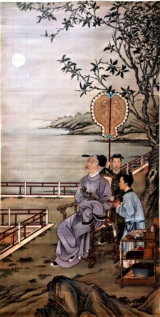 弘历观月图以康熙时期冷枚绘《赏月图》为范本,于画面右侧加绘茶架。画中弘历作汉族士人装扮,赏月、饮茶。童子手捧朱漆茶盘,上置青花盖碗。旁侧的双层斑竹茶架中盛放有各类茶具。在现场可以看到画中文物的“同款”: