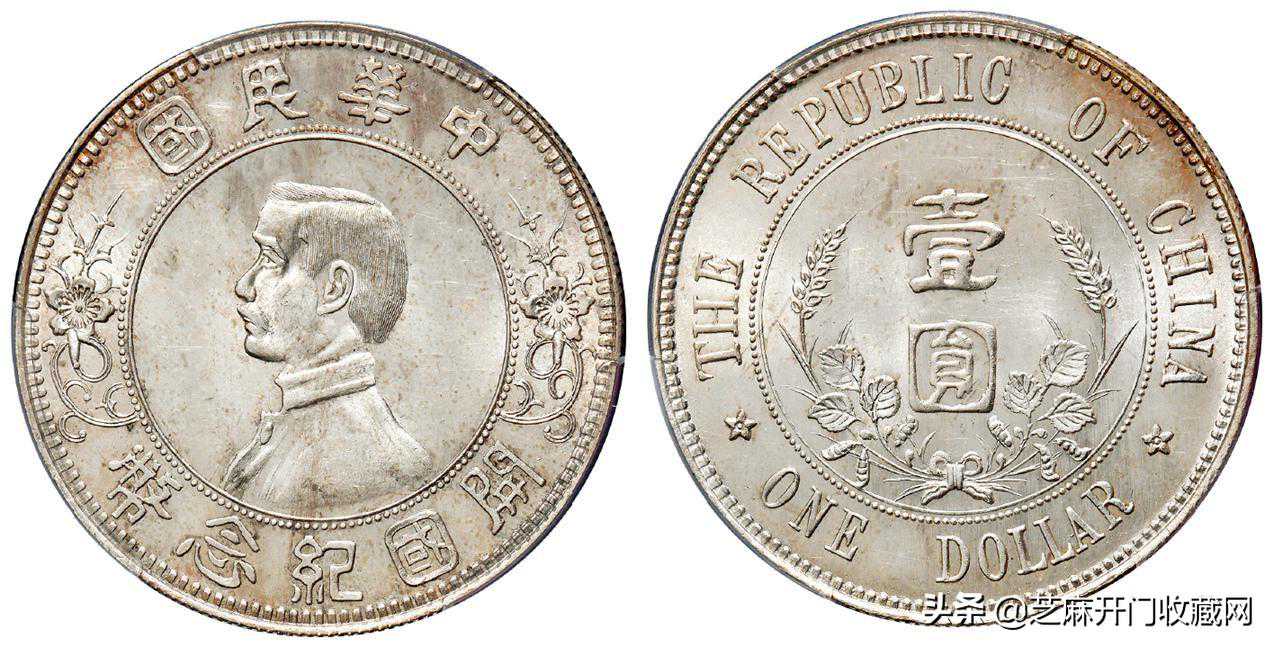 孙中山币的背面是隶书壹圆和嘉禾纹,边缘是英文的中华民国,壹圆,左右是五角星,后来改成了六角星。其直线边齿,重量是26.6克,含银量为90%到91.9%左右,发行量比较多,流通范围也比较广。不过,这版钱币并非民国元年铸造的,这一点需要特别注意。