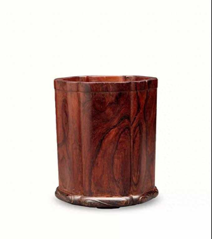 清早期黄花梨葵口笔筒,参考价:20万-30万,此筒以黄花梨木为材制成,作葵花形。整器打磨光润,颜色深沉,包浆自然,简约雅致,突出了木材纹理的自然美和书卷气,显示了文雅之气。