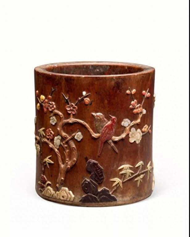 清早期黄花梨百宝嵌小笔筒,参考价:15万-25万,百宝嵌始于明,盛于清。是把宝石、珍珠、珊瑚、翡翠、玛瑙、象牙、螺钿等一些珍贵材料混合镶嵌,利用其不同的色泽达到五彩缤纷的艺术效果。