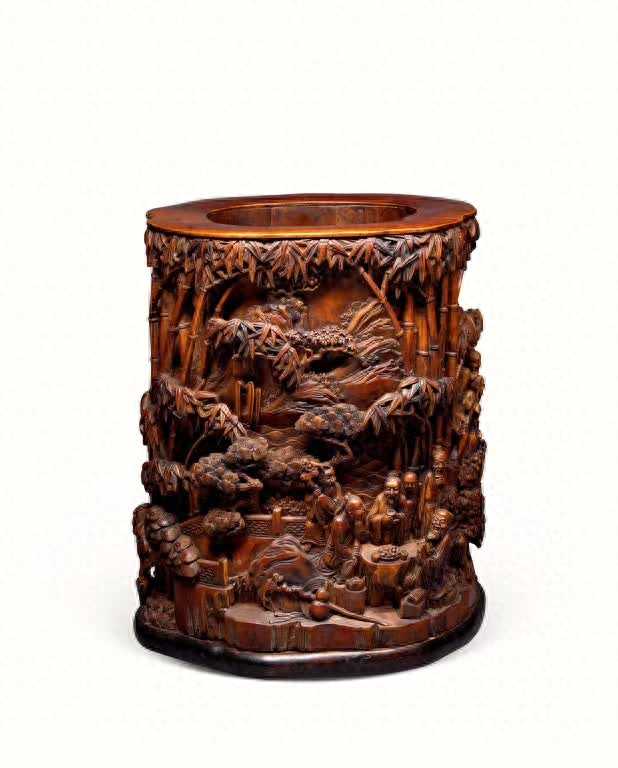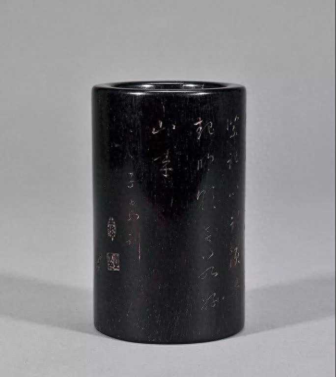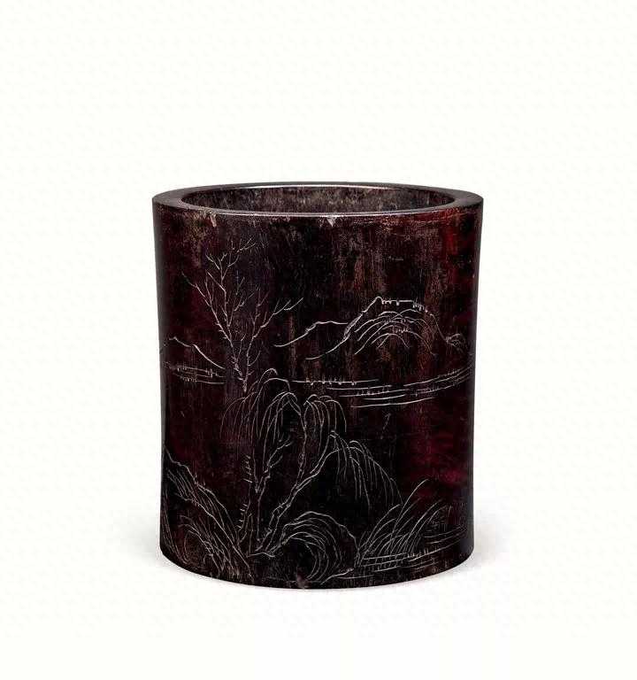 清中期罗聘款仿倪云林画意紫檀笔筒,参考价:78万-98万,取紫檀为材,整挖而成,直筒式。其造型简洁沉稳,本身纹理和色泽更显得此器素雅大方。