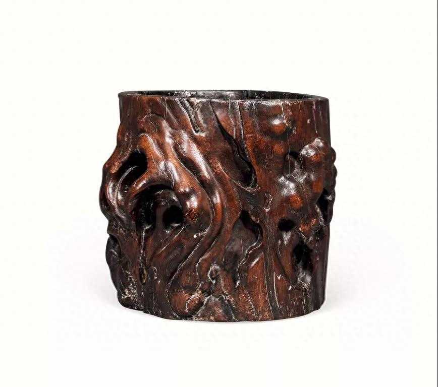 清早期黄花梨笔筒,参考价:13万-23万,此件笔筒以黄花梨整挖制成,形器较大,体形厚实,构思巧妙,置于几案,实用之余,如同置老树槎根于案头,宛若将自然之韵融入书斋,有古朴清雅之韵,体现主人追求自然返璞的天成之境。