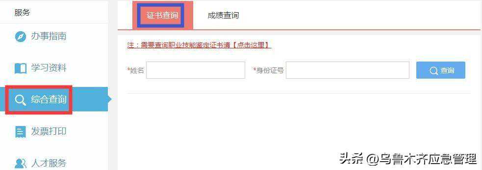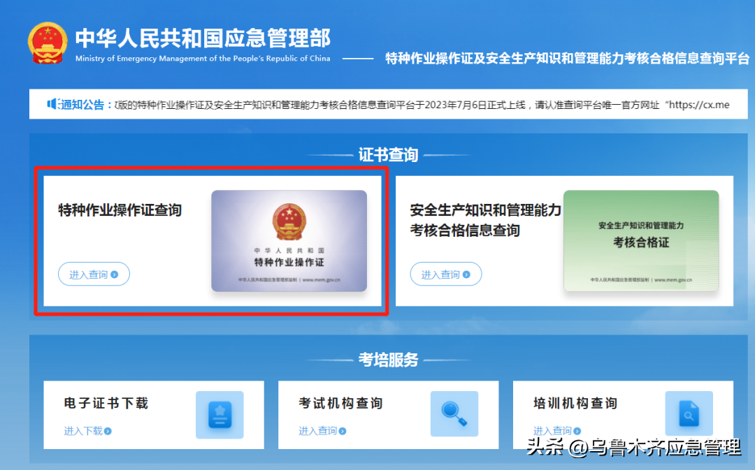 方法二:登录应急管理部政府网站(),从“服务”中的“查询服务”进入“特种作业操作证及安全生产知识和管理能力考核合格信息查询平台”(以下简称“证书查询平台”),使用注册并实人认证的手机号登录系统,下载打印电子证书。