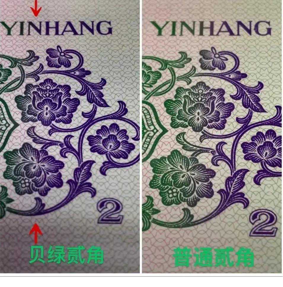 贝绿于普通2角,版别特征非常明显,正面2角右下方英文字母的花纹内有一处绿色印记,呈现贝字形态,取名为贝绿2角。