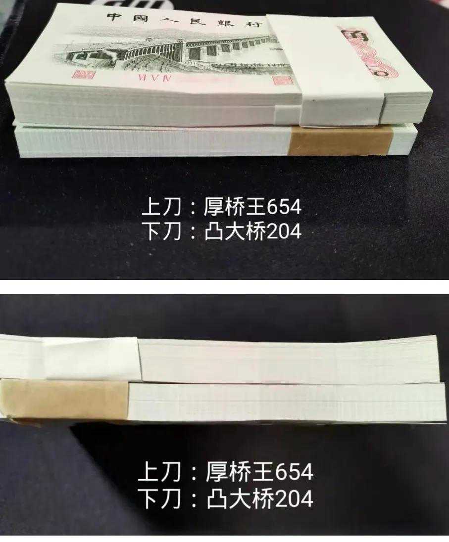 如下图所示,整刀状态下“厚桥王”654冠与凸大桥204冠的对比,可见“厚桥王”不仅纸张偏厚,而且整体币面尺寸略小,在长度上比普通三版贰角短一些。